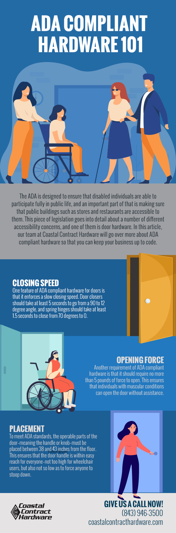 New specifications and laws for buildings are continually being incorporated into building codes, so people can easily access and navigate certain parts of commercial spaces in a safe, convenient manner. As you outfit your building in Myrtle Beach, South Carolina with new hardware, you need to keep people using wheelchairs, scooters, walkers, and those with mobility issues in mind to comply with these regulations.