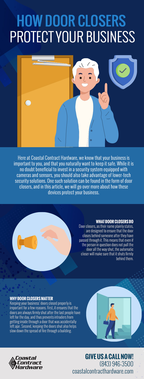 In addition to their role in fire safety, door closers also serve an important role in security purposes, as they ensure that no door is left open for unwanted persons to enter. You’ll never have to worry about a door not quite swinging shut behind you as you leave work for the night. Another benefit of door closers is that they close the door at a controlled rate, so you won’t have to worry about doors slamming, or the potential injuries that could result from a heavy door swinging shut unexpectedly. With door closers from us at Coastal Contract Hardware, you can eliminate nagging, everyday worries that you may not have even been aware of, and you can rest easier knowing that your business and employees are safe.